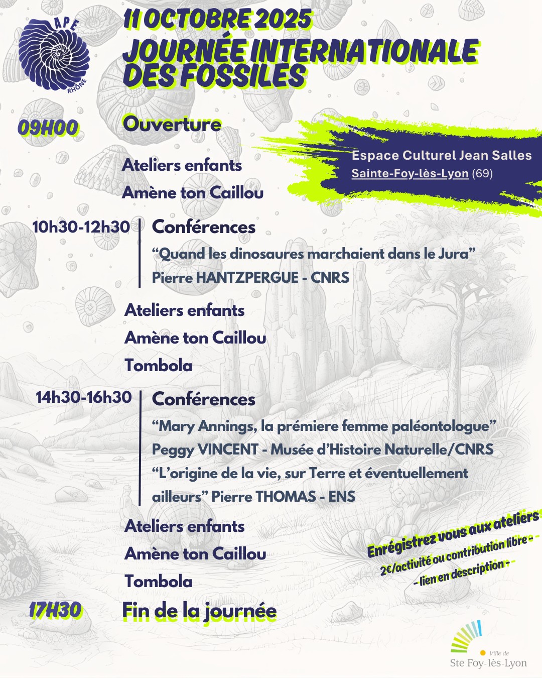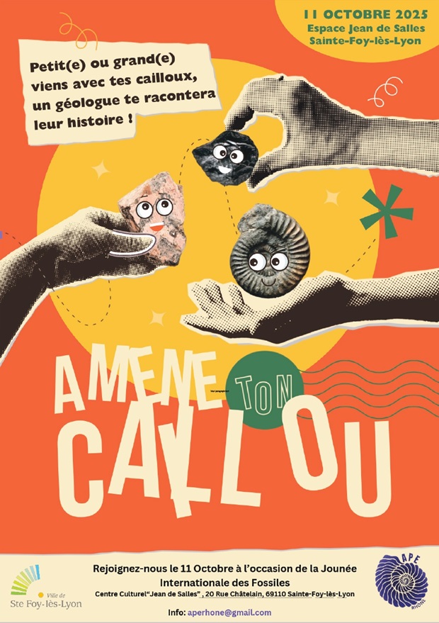 JJournée Internationale des Fossiles L’Association des Paléo-Explorateurs du Rhône (APE Rhône), en partenariat avec la Ville de Sainte-Foy-lès-Lyon, organise la première Journée Internationale des Fossiles.Cet événement inédit, gratuit et familial a pour objectif de sensibiliser le grand public à l’histoire fascinante de la vie sur Terre, de promouvoir la culture scientifique et de valoriser le patrimoine géologique de la région.Une journée pour tous les explorateurs du passé ! Que vous soyez simple curieux, amateur de fossiles ou passionné confirmé, l’APE Rhône vous invite à une journée conviviale de découverte de la paléontologie, pour petits et grands.> Au programme :Exposition de fossiles issus de notre collectionConférences grand public animées par des spécialistes du CNRS, de l’ENS de Lyon et de l’Université Claude Bernard Lyon 1Ateliers créatifs et pédagogiques pour enfants et adultesGrande tombola avec des fossiles authentiques à gagnerPour en savoir plus, consultez le site :APE Rhône