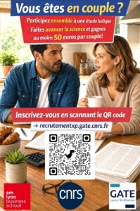 Ateliers Droit - économie - gestion / Homme - société Du 30 avril 2026 au 30 juin 2026 EM Lyon Business School|Groupe d'Analyse et de Théorie Economique - GATE CContribuez à la recherche sur les comportements des ménages | Appel à participation Vous êtes en couple ? Est-ce toujours simple de décider à deux ? Et comment décider dans un monde de plus en plus incertain ? Les chercheurs en économie se posent les mêmes questions.À Lyon, une équipe d’experts du Groupe d’Analyse et de Théorie Économique (GATE) et d’emlyon business school travaille actuellement sur un projet de recherche portant sur les décisions économiques des couples. Pour cela, l’équipe est actuellement à la recherche de couples pour participer à une étude sur la prise de décision.Participant.es recherché.es : L’étude s’adresse aux couples hétérosexuels dont les deux partenaires ont entre 23 et 40 ans et qui sont en relation depuis au moins trois ans.L’expérience : Les sessions se déroulent en couple, en présentiel à l’Université Lumière Lyon 2, quai Claude Bernard, Lyon 7e. Chaque session dure deux heures et comprend un temps d’échange avec les chercheurs. Elle consiste à réaliser des tâches simples et à répondre à des questionnaires et se termine par un temps de débriefing. L’étude ne comporte pas de risque particulier et ne nécessite aucune connaissance préalable. Rémunération :La participation est rémunérée, avec un minimum de 50 euros par couple et la possibilité de gains plus élevés.>> Pour participer, inscrivez-vous via ce lien :Participer©GATE Université Lumière Lyon 2 18 Quai Claude Bernard, Lyon, France