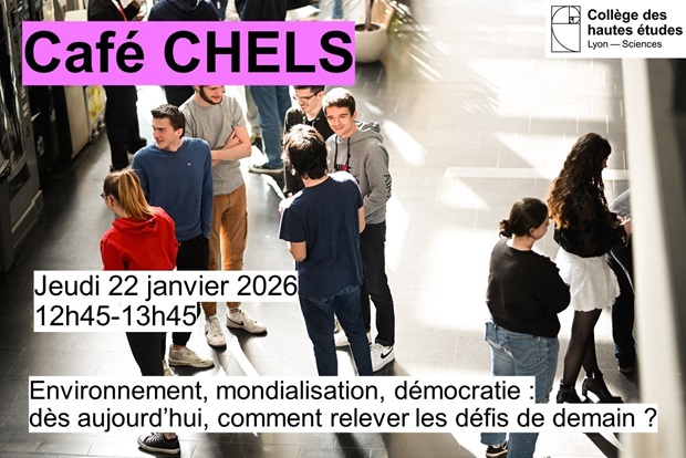 Droit - économie - gestion / Écologie - agronomie - développement durable - énergie / Homme - société 22 janvier 2026 de 12h45 à 13h45 Collège des Hautes Études Lyon Sciences - CHELS EEnvironnement, mondialisation, démocratie : dès aujourd’hui, comment relever les défis de demain ? | Cafés du CHELS Les cafés du CHELS – Collège des hautes études Lyon – Sciences – sont des rendez-vous de débats et échanges scientifiques qui ont pour objectifs de croiser les regards sur une thématique scientifique ou d’actualité.Pour ce rendez-vous, trois enseignants du CHELS seront présents pour aborder la question « Environnement, mondialisation, démocratie : dès aujourd’hui, comment relever les défis de demain ? ».> La rencontre est proposée en distanciel : vous pourrez suivre les échanges et poser vos questions en direct sur le YouTube du CHELSIntervenants :Michel Lussault, géographe, professeur des universités, École Normale Supérieure de Lyon ;Lionel Sitz, enseignant-chercheur en sociologie de la consommation et dynamique des marchés, emlyon business school ;Natacha Gondran, professeur en évaluation environnementale, École Nationale Supérieure des Mines de Saint-Étienne.Animé par : Christine Berton, chargée de projets science et société – CCSTI La Rotonde – École Nationale Supérieure des Mines de Saint-ÉtiennePour en savoir plus :CHELSSe connecter à la rencontre