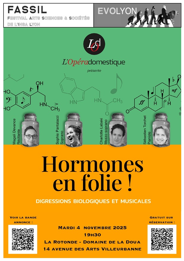 Spectacle Art - Sciences / Biologie - santé / Homme - société 04 novembre 2025 à 19h30 ENS de Lyon HHormones en folie ! Digressions biologiques et musicales Imaginé par une chercheuse en biologie de l’ENS de Lyon, ce spectacle mélange deux ingrédients que tout oppose à priori : le chant lyrique et la biologie, en les mettant à portée de tous. Car sans l’amour, pas plus d’opéras que d’êtres vivants ! Nous découvrirons donc comment des millions d’années d’évolution ont façonné nos hormones pour nous pousser à nous reproduire… nous offrant au passage l’émotion amoureuse, et bien plus encore, l’émotion musicale ! Ceci nous sera illustré par une variété d’airs d’opéra et chansons, connus ou moins, du baroque au contemporain, et d’amusantes découvertes des chercheurs, éclairant d’un autre jour tous nos chambardements émotionnels.Venez partager tout à la fois le plaisir de la musique et le plaisir de comprendre !Intervenants :Compagnie l’Opéra Domestique avec Sophie Pantalacci, soprano et directrice de recherche au CNRS/ENS de Lyon ; Charlotte Labaki, mezzo-soprano ; Sébastien Torchet, piano ; Magali Devance, récitante.Le spectacle est proposé gratuitement en clôture de la conférence Evo-Lyon et en OFF du Festival Arts Sciences et Sociétés – FASSIL – de l’INSA de Lyon.>> Regarder la bande-annonce : iciPour en savoir plus :Hormones en folie ! Campus LyonTech la Doua - Bât. La Rotonde 20 Avenue des Arts, 69100 Villeurbanne, France