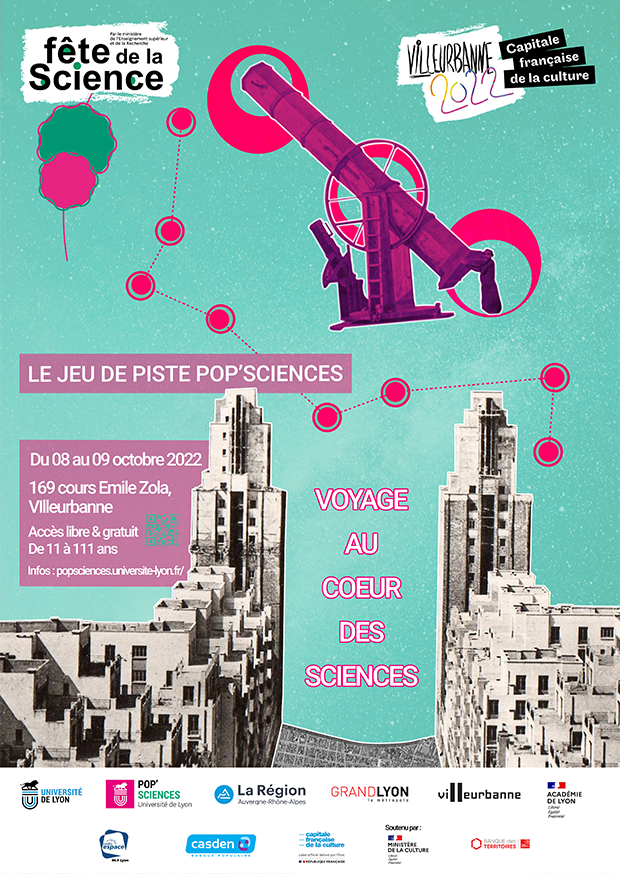 Balade urbaine / Jeu / Parcours scientifique Toutes thématiques Du 07 octobre 2022 au 09 octobre 2022 De 9h à 18h Pop'Sciences - Université de Lyon VVoyage au cœur des Sciences | Un jeu de piste Pop’Sciences À l’occasion de la Fête de la science, partez à la découverte de Villeurbanne, son patrimoine, ses sciences et ses secrets oubliés dans ce grand jeu de piste. Découvrez l’histoire de femmes et d’hommes qui ont contribué à certaines des avancées majeures de la science dans l’histoire, à travers des énigmes coconçues avec des chercheurs et des acteurs du territoire de Villeurbanne.Que vous soyez intéressé par l’architecture, la cosmologie, l’écologie, ou encore l’histoire ou la paléontologie, ne manquez surtout pas cette grande aventure urbaine. Du quartier des Gratte-Ciel au campus de La Doua, vous découvrirez Villeurbanne comme vous ne l’aviez jamais vu. Un jeu de piste avec plusieurs énigmes autour d’un astronome autodidacte disparu…Cet évènement se déroulera du 7 au 9 octobre 2022 avec une présence à différentes étapes de chercheurs et passionnés de sciences.Rendez-vous au niveau de la tente Fête de la science à l’intérieur de la zone d’occupation temporaire du quartier Gratte-ciel !Vendredi 7 octobre : réservé aux publics scolaires (sur inscription), du collège au lycée.Samedi 8 et dimanche 9 octobre : jeu ouvert à toutes et tous en continu – de 9 h à 17 h Merci aux nombreuses structures partenaires impliquées dans la conception, l’animation du jeu de piste et dans la proposition des lots à gagner :Centre de Recherche d’Astrophysique de Lyon (CRAL), Laboratoire de Géologie de Lyon (LGL), Si/Si les femmes existent, Compagnie Corps au Bord, la Médiathèque du Tonkin, le RIZEEbullisciences, Abstract Hypothesis, Occupation Temporaire des Gratte-Ciel, Conseil Municipal de la Jeunesse de VilleurbannePlanétarium de Vaulx-en-Velin, Observatoire de Lyon, Musée Saint-Romain-en-Gal Zone d'Occupation Temporaire des Gratte-Ciel 169 Cr Emile Zola, 69100 Villeurbanne, France Rendez-vous au niveau de la tente Fête de la sciences à l’intérieur de la zone d’occupation temporaire !