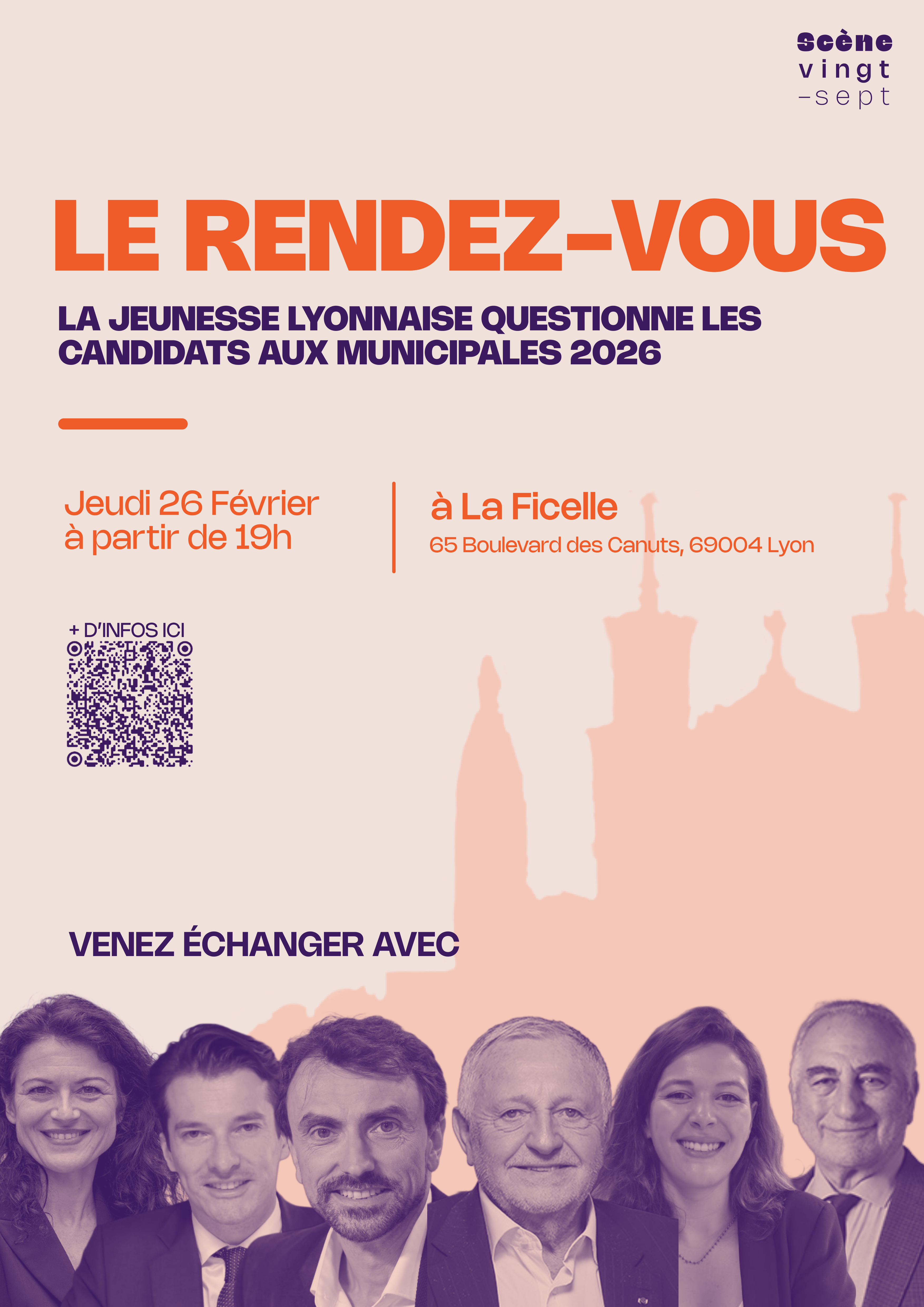 26 février 2026 Ouverture des portes à 19h Scène 27 «« Le Rendez-Vous » “Le Rendez-Vous” : La jeunesse lyonnaise questionne les candidats aux municipales 2026 ️ Jeudi 26 février – 19h La Ficelle On parle souvent des jeunes et de leurs problématiques. Rarement avec eux.Avec Le Rendez-Vous, Scène27 propose une soirée pour remettre les jeunes au cœur des discussions sur l’avenir de Lyon : débattre, questionner et échanger directement avec les candidats à la mairie. Une expérience collective mêlant discussions en petits groupes et échange direct avec les candidats, dans un cadre strictement apartisan, respectueux et équitable.Inscription gratuite obligatoireInfos & réservations La Ficelle 65 Boulevard des Canuts, Lyon, France