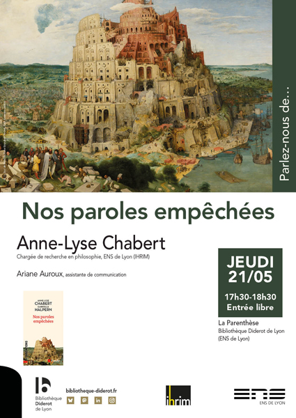 À l’occasion de la parution du livre Nos Paroles Empêchées (Éditions de l’Aube, 2026) co-écrit par les philosophes, Gabrielle Halpern et Anne-Lyse Chabert, cette dernière évoquera le sujet à la Parenthèse et échangera avec le public.