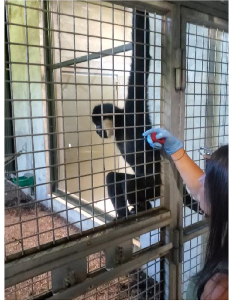 Séance de training médical, grâce à l’utilisation d’un clicker, avec un gibbon.