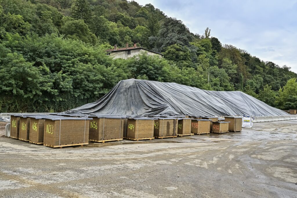 Sous cette imposante bâche noire, se trouvent les 4000 tonnes de terre nécessaires pour réaliser l’ensemble du chantier. Cette ressource provient d’une carrière située à 12 kilomètres de celui-ci. De cette carrière sont extraits des matériaux pour réaliser du ciment. Pour les atteindre, il est nécessaire d’enlever une couche de terre argileuse, alors inutilisée : un déchet pour la carrière, mais une mine d’or pour le pisé. « Rien n’est ajouté à la terre et elle n’est pas cuite. Ainsi, sa seule empreinte carbone provient de son transport », précise Antoine Gouachon.