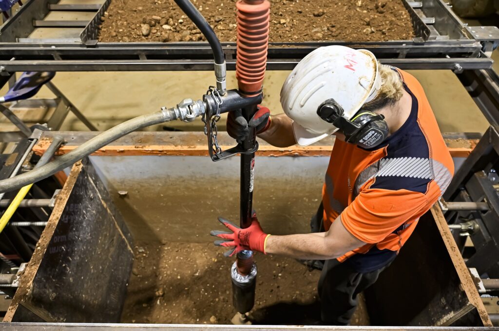 Les opérateurs tassent, ensuite, la couche avec un fouloir pneumatique, jusqu’à ce que celle-ci ne fasse plus que 5 à 6 centimètres d’épaisseur. « La terre utilisée est un mélange d’argiles, de limons, de sables, de graviers et de cailloux. Quand on compacte tous ces éléments, ils se placent les uns à côté des autres et l’air est chassé, jusqu’à ce qu’il n’y ait plus d’espace vide. Cela crée un véritable béton d’argile », nous explique Antoine Gouachon. La superposition de couches fines donne alors une grande densité au bloc et une importante résistance à la compression : un gage de solidité.