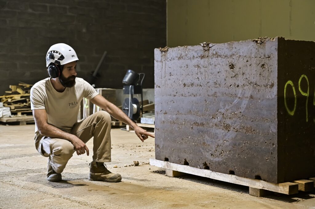 En 2026, à Lyon, sortira de terre ce qui est annoncé comme le plus grand bâtiment en pisé de France : les Ateliers de la danse. Ce futur lieu dédié aux pratiques artistiques sera construit grâce à cette technique à base de terre crue, dont est spécialiste l’entreprise PRÌA Construction. Antoine Gouachon, architecte et cofondateur de l’entreprise, nous fait visiter l’atelier de pré-fabrication des blocs de pisé destinés à l’édifice, situé à Vienne (Rhône).