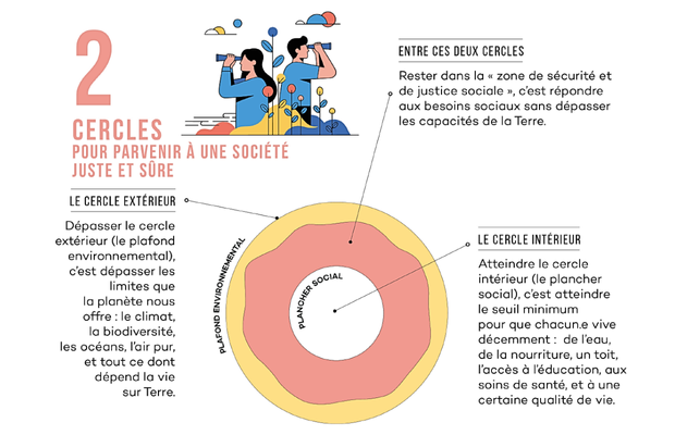 Elle définit un espace sûr et juste pour l’humanité, délimité par un plancher social et un plafond écologique.