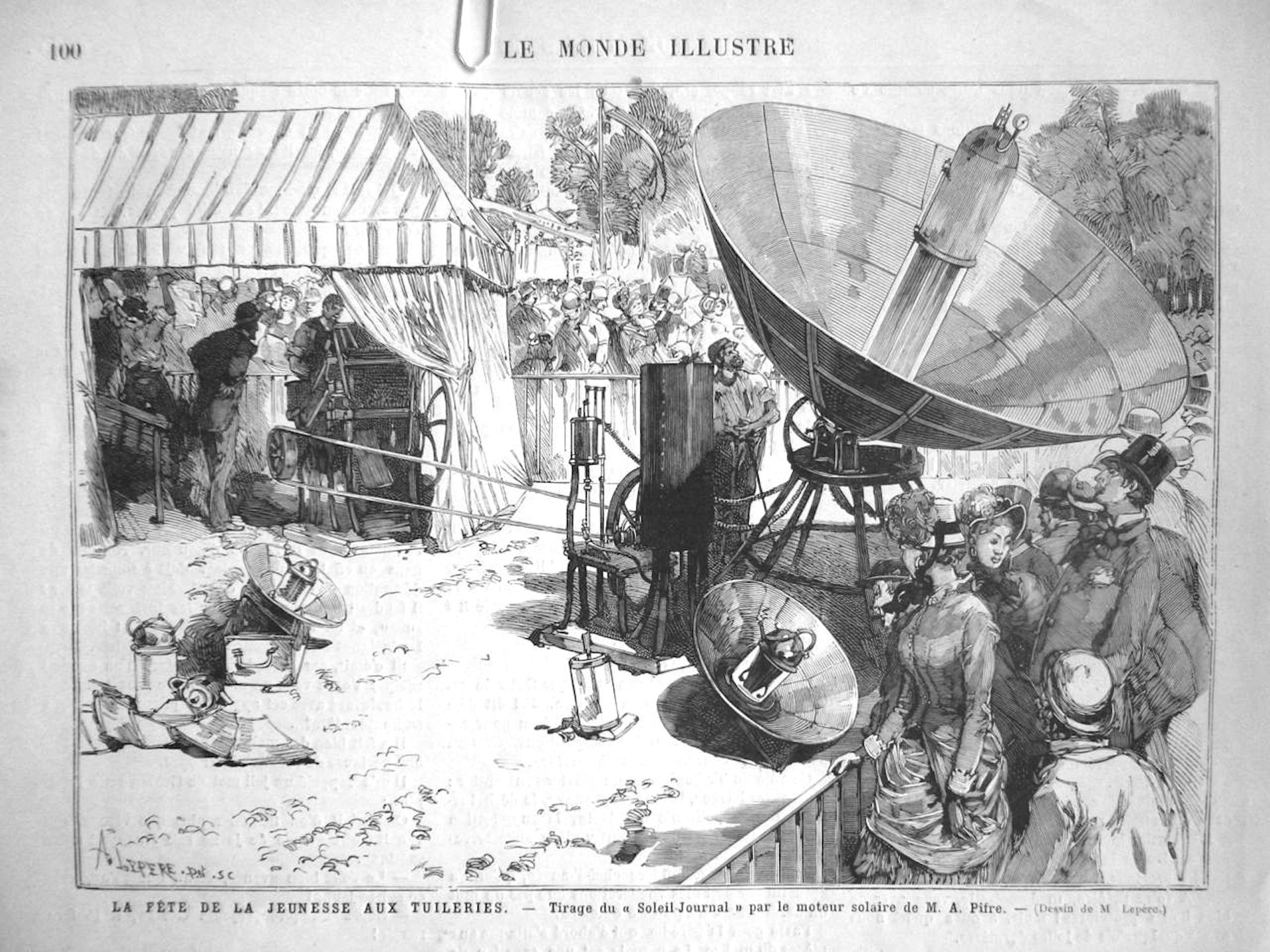 Écologie - agronomie - développement durable - énergie Article The Conversation LLe développement de l’énergie solaire a-t-il été torpillé en 1882 ? | The Conversation Dessin de couverture du magazine hebdomadaire illustré la Science populaire, en août 1882. | ©Fourni par l’auteurÀ la fin du XIXe siècle, le Français Augustin Mouchot inventait un ingénieux concentrateur solaire. Mais la bureaucratie technique de l’époque, chargée de l’évaluer, en a livré une appréciation biaisée en la comparant au charbon qui alimentait les machines à vapeur – condamnant, au passage, l’appareil et ses multiples applications.En matière d’énergie solaire, plusieurs moyens ont permis, au XXe siècle, de stopper l’innovation et de garantir le monopole des énergies fossiles et de leurs savoirs. Par exemple : la menace pure et simple, le rachat de brevets, la montée au capital ou encore la fermeture d’activité. L’expertise tendancieuse – sinon mensongère – a pu constituer un autre levier, ainsi que le montre le cas de l’évaluation officielle des appareils solaires d’Augustin Mouchot et de son associé Abel Pifre, à la fin du XIXe siècle.Absent des manuels scolaires et délaissé des commémorations nationales pour le bicentenaire de sa naissance en 2025, le professeur de mathématiques appliquées et de physique Augustin Mouchot (1825-1912) est le pionnier français méconnu de l’énergie solaire moderne.Four solaire de Mouchot et Pifre, conservé au CNAM à Paris. | ©Rama/Wikimedia, CC BY-SAIl a défendu et démontré les atouts de l’énergie solaire thermique et thermodynamique, particulièrement pour les pays de la zone intertropicale. Et cela, dès son ouvrage de synthèse et de prospective en 1869, puis avec un premier moteur à vapeur solaire de retentissement international, présenté à l’Exposition universelle de 1878 à Paris.Mais ce dernier a également rencontré après une mission de trois ans en Algérie et des financements publics importants, les incompréhensions auxquelles les énergies énergies renouvelables ont été confrontées depuis cette période. Ce qui n’a pas été sans lui valoir des adversaires…Une commission d’étude transsaharienne de la chaleur solaireLa Commission des appareils solaires est créée le 19 février 1880 dans le cadre des travaux préparatoires du chemin de fer transsaharien. Elle doit tester les concentrateurs solaires à vapeur développés depuis près de 15 années par Augustin Mouchot – et depuis 1878 par Abel Pifre – dans la perspective du pompage de l’eau indispensable à la recharge des locomotives et au développement de gares-dépôts de combustible.L’assassinant du colonel Flatters et de son escorte lors de la seconde reconnaissance du tracé, le 16 février 1881, un an et deux mois avant la remise du rapport de la commission, mettra fin au projet.La commission rassemble alors deux ingénieurs, un colonel et deux professeurs aux facultés de médecine et des sciences de Montpellier. L’appareil solaire testé, doté d’un réflecteur de trois mètres de diamètre, est construit par la société d’Abel Pifre, officiellement constituée en janvier 1881 et première entreprise au monde à commercialiser des cuiseurs, distillateurs et moteurs solaires.Les essais ont lieu en 1881 au fort de Montpellier sous la supervision du professeur de physique André Crova (1833-1907), qui rédigera le rapport final.Docteur en physique électrochimique, avec 74 publications touchant à l’optique, à l’électricité, aux « radiations calorifiques » – dont celles du Soleil –, c’est un pionnier du calcul de la « constante solaire », quantité d’énergie solaire reçue par la Terre hors atmosphère sur une surface d’un mètre carré exposée perpendiculairement au soleil.Les étranges calculs du « rendement industriel »La note manuscrite d’André Crova, discutée durant la séance du 3 avril 1882 de l’Académie des sciences, est la version courte du rapport qu’il publie dans les mois suivants, qui comporte quarante-cinq pages et une illustration.Son diagnostic déborde du projet transsaharien et met en regard l’énergie solaire avec la grande énergie fossile, alors concurrente, que représente le charbon.« On s’est préoccupé dans ces dernières années de tentatives faites en vue d’utiliser pratiquement l’énergie des radiations solaires. Ces radiations sont en effet la cause presque unique de tous les phénomènes atmosphériques, de tout travail moteur, et de la vie sous toutes ses formes, à la surface de notre globe. Mais ces forces motrices, irrégulières et sujettes même à faire défaut à un moment donné, sont maintenant partout remplacées par celle de la vapeur, qui, toute coûteuse qu’elle est, a du moins pour elle la constance et la régularité, qui sont une des premières conditions que l’industrie demande à un moteur. »André Crova inaugure ainsi le discours des experts dont l’influence va se renforcer au fil de l’ère thermo-industrielle. Spécialiste d’un domaine étroit – la mesure des radiations solaires –, il est mandaté pour l’évaluation d’une technologie de conversion énergétique – les récepteurs solaires thermodynamiques Mouchot-Pifre –, dans le cadre d’une ligne de transport à l’intérieur du Sahara.Au final, il délivre un avis non pas sur le fond, mais sur sur les formes d’énergie qui devraient être privilégiées dans le cadre de la modernité. Ce glissement fait de son rapport la première grande condamnation officielle de l’utilisation du rayonnement solaire pour produire de l’énergie.Car la commission ne s’arrête pas sur les applications pratiques de la machine à vapeur solaire. Citons par exemple :189 jours de fonctionnement sur l’année en 1881 à la latitude de Montpellier et 14 litres d’eau distillée (c’est-à-dire, vaporisée) par jour de fonctionnement en moyenne 