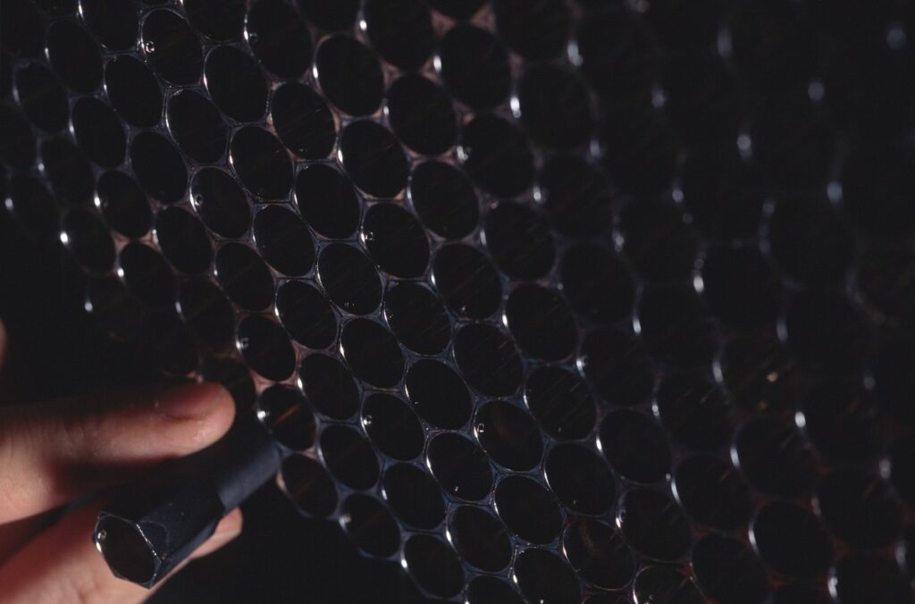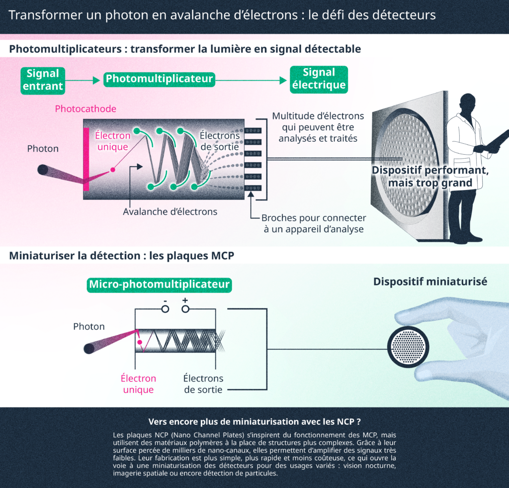 Ressources Article Écoles d'ingénieurs / Lycée LLes polymères, nouvelle voie pour la mise au point de nano-détecteurs | #3 © Laurence MEDARD/CNRS Images Ressource #3 du dossier Pop’Sciences – CNRS : « ANNÉE DE L’INGENIERIE – Quand l’ingénierie façonne la recherche scientifique » ARTICLE Pour détecter avec précision des particules élémentaires, des scientifiques développent des capteurs composés de millions de « nano-canaux », des tubes mille fois plus fins qu’un cheveu. En tapissant l’intérieur de ces minuscules tunnels de nouveaux matériaux à base de polymères, une équipe lyonnaise espère créer des dispositifs plus compacts et plus sensibles. Une piste innovante qui permettrait de transformer la détection à haute résolution en physique fondamentale.Le télescope CAT (Cerenkov array at Themis), installé à la centrale solaire THEMIS (Targasonne, Pyrénées Orientales) : observation des gammas cosmiques dès l’énergie de 200 GeV. Vue de la face avant de la caméra. Les points clairs correspondent à la maille de l’imagerie. Dans la main : un des 600 photomultiplicateurs (chacun répond en un milliardième de seconde après l’arrivée d’un photon). © Laurence MEDARD/CNRS ImagesQu’il s’agisse de construire un appareil photo pour immortaliser nos souvenirs de vacances ou un détecteur de particule pour mieux comprendre la structure fondamentale de la matière, le système fonctionne toujours de la même manière : il convertit un signal entrant (photons ou particules) en un signal électrique lisible par l’électronique de l’appareil et exploitable ensuite.Dans le cas du capteur d’un appareil photo, par exemple, les photons lumineux incidents produisent des charges électriques dans chaque pixel du détecteur formant l’image. Mais lorsque l’intensité lumineuse est extrêmement faible, le nombre de photons est insuffisant pour constituer une charge électrique détectable.Pour ces détections extrêmes, des « photomultiplicateurs » ont longtemps été utilisés.L’arrivée d’un seul photon sur un photomultiplicateur émet un unique électron, accéléré et amplifié ensuite en cascade à travers une série d’électrodes jusqu’à produire une « avalanche électronique » bien plus importante, détectable par les circuits en aval de l’appareil (cf. illustration ci-dessous). Ce dispositif est extrêmement sensible et particulièrement adapté à la détection de signaux lumineux très faibles, ou de particules uniques. Son inconvénient est sa taille, typiquement une dizaine de centimètres. On pourrait imaginer construire un détecteur similaire à un capteur photo, ou chaque pixel est constitué d’un photomultiplicateur, mais la taille finale du système ainsi construit serait plus grand qu’un être humain !Transformer un photon en avalanche d’électrons : le défi des détecteurs © Emilie JosseLa miniaturisation : le secret pour des détecteurs toujours plus performants.Depuis les années 1980, la miniaturisation a mené à la création des Micro-Channel Plates (MCP) : des plaques fines de quelques centimètres carrés percées de millions de micro-tubes métallisés, où chaque canal joue le rôle d’un photomultiplicateur miniature.Leur extrême sensibilité, leur rapidité et leur précision en ont fait des composants essentiels dans des domaines très différents comme les dispositifs de vision nocturne, l’imagerie spatiale ou la détection de particules avec une très grande résolution.Mais un obstacle demeure dans la course à la miniaturisation de ces dispositifs. En dessous d’une dizaine de microns1, il devient très difficile d’assembler des nanotubes réguliers et surtout de les recouvrir uniformément de matériaux métalliques actifs pour amplifier les charges électriques produites. Les méthodes classiques fonctionnent correctement dans le cas de micro-tubes, mais ils s’avèrent inadéquates pour un dépôt à l’échelle nanométrique.Plus petit, plus précis… les polymères passent à l’échelle nanométriqueC’est dans ce contexte qu’une discussion entre Anatoli Serghei, physicien au laboratoire Ingénierie des matériaux polymères2(IMP), et des membres de l’Institut de physique des deux infinis de Lyon3(IP2I), fait émerger une idée nouvelle : utiliser les avancées récentes dans la création de membranes d’aluminium percée de trous de taille nanométriques pour concevoir, non plus des Micro-Channel Plates (MCP), mais des Nano-Channel Plates (NCP), des capteurs dont la résolution pourrait atteindre 100 à 1000 fois celle des dispositifs MCP existants.Comparaison du diamètre des tubes de détection dans un Micro-Channel Plate classique (MCP, à gauche) et un Nano-Channel Plate (NCP, à droite).L’échelle, en haut à gauche de chaque image, montre que les tubes des NCP sont 100 fois plus fins que les MCP. © Anatoli SERGHEIReste à revêtir ces nano-canaux de matériaux capables d’émettre des électrons lorsqu’ils sont frappés par une particule, condition indispensable pour déclencher l’avalanche électronique. La solution viendra des matériaux développés au sein du laboratoire où travaille aujourd’hui Anatoli Serghei : les polymères.Des chaînes de perles moléculaires« Un polymère est une chaîne de molécules appelées monomères liées entre elles et répétées un grand nombre de fois pour former une macromolécule, comme un collier de perles » nous dit Anatoli Serghei. Il en existe de nombreux exemples, omniprésents dans la vie courante, du polyéthylène à partir duquel sont fabriquées les bouteilles en plastique à l’ADN de nos cellules. Longtemps considérés comme isolants, certains se sont finalement révélés conducteurs. Cette découverte a été récompensée par le Prix Nobel de Chimie en 2000 (Heeger, MacDiarmid & Shirakawa).Contrairement aux métaux, très difficiles à déposer de manière homogène en phase gazeuse d