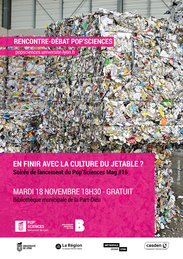 EEn finir avec la culture du jetable ? / Soirée de lancement du Pop’Sciences Mag #16 À l’occasion de la sortie du 16e numéro du Pop’Sciences Mag « Matière, vers un cycle vertueux », l’équipe Pop’Sciences et la bibliothèque municipale de Lyon proposent de venir interroger notre relation à la matière : comment en finir avec la culture du « jetable » ?Des objets du quotidien aux matériaux de construction, en passant par nos véhicules, nous consommons sans cesse de la matière. Des ressources qui sont pourtant limitées, et qui terminent leur vie parmi les plus de 300 millions de tonnes de déchets produits par an en France. Il devient, alors, important de penser de nouveaux modèles de consommation, d’usages et de gestion de ces matières.Des alternatives existent : nos objets électroniques inutilisés sont de potentielles mines à métaux précieux ; des tuiles d’un bâtiment déconstruit peuvent être réutilisées dans un nouvel édifice ; vos pneus de voiture pourraient vous être prêtés, et une fois abimés, être remis à neuf par leur producteur…En présence de scientifiques et experts lyonnais, nous interrogerons ces alternatives et discuterons de leurs limites, souvent structurelles, réglementaires ou encore culturelles. Quels leviers permettraient de les généraliser ?La rencontre-débat proposera un éclairage sur ces questions grâce aux regards croisés de :Fanny Verrax, professeure associée en transition écologique et entrepreneuriat social, emlyon business school.Jean-François Gérard, professeur à l’INSA Lyon, directeur du PEPR « Recyclage, recyclabilité et réutilisation des matières ».______________________________________________________________________________________________________>> PROGRAMME :18h30 – Présentation du 16e numéro du Pop’Sciences Mag18h45 – Rencontre – débat19h45 – Discussion avec le publicUn exemplaire du Pop’Sciences Mag #16 vous sera remis dans le cadre de cette rencontre.________________________________________________________________________________________________________Cet événement Pop’Sciences – Université de Lyon est organisé en collaboration avec la Bibliothèque municipale de la Part-Dieu.Le Pop’Sciences Mag #16 « Matière, vers un cycle vertueux » a été :Réalisé grâce à la contribution de chercheurs issus des établissements et instituts suivants : Université Claude Bernard Lyon 1, Université Lumière Lyon 2, Université Jean Moulin Lyon 3, Université Jean Monnet Saint-Étienne, École normale supérieure de Lyon (ENS de Lyon), Centrale Lyon, Institut national des sciences appliquées Lyon (INSA Lyon), Sciences Po Lyon, École nationale des travaux publics de l’État (ENTPE), École nationale supérieure d’architecture de Lyon (ENSAL), emlyon business school, CPE Lyon, Mines Saint-Étienne, Centre national de la recherche scientifique (CNRS), Institut Carnot Ingénierie@Lyon, Institut de Recherche pour le Développement (IRD), Bureau de recherches géologiques et minières (BRGM), Université de Lancaster. Développé avec le soutien de la Métropole de Lyon, de la Région Auvergne-Rhône-Alpes et de la CASDEN. Photo Vincent Noclin