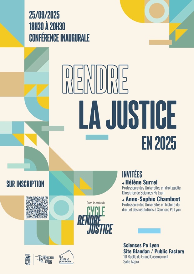 RRendre la justice en 2025 : enjeux et défis | ANNULÉ SOIRÉE ANNULÉEPour cette nouvelle saison autour de la thématique “Rendre justice”, le cycle d’événements scientifiques et culturels nous invite à réfléchir sur la place et le rôle de la justice dans notre société contemporaine.Plusieurs questions centrales seront explorées : la justice remplit-elle pleinement ses missions aujourd’hui ? Comment fonctionne le système judiciaire français ? Quelles nouvelles formes de justice émergent dans notre société ?Intervenantes : Hélène Surrel, Professeure de droit public et Directrice de Sciences Po Lyon ;Anne-Sophie Chambost, Professeure d’histoire du droit et des institutions à Sciences Po Lyon.Pour en savoir plus :Public Factoty