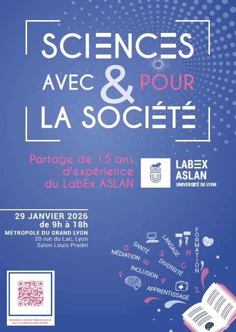 SSciences avec et pour la société Le LabEx ASLAN – Études avancées sur la complexité du langage – participe au développement de la valorisation sociétale du territoire de l’Université de Lyon, en étroite collaboration avec les organismes existants des tutelles tels que le service Culture, Sciences et Société de l’Université de Lyon, Pulsalys ou encore les services valorisations du CNRS et de l’ENS de Lyon. Par ailleurs, les membres du LabEx développent des relations avec des partenaires extra-académiques, allant d’hôpitaux à des entreprises en passant par des associations.C’est ainsi que fort d’une expérience de 15 ans dans la recherche transdisciplinaire ayant comme objet le langage et son impact sociétal, le LabEx ASLAN organise une journée de partage d’expérience.Pour en savoir plus :Journée Sciences avec et pour la société