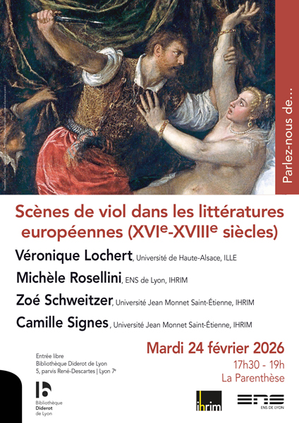 PParlez-nous de… Scènes de viol dans les littératures européennes (XVIe-XVIIIe siècles) De l’Italie de la Renaissance à la France révolutionnaire en passant par l’Espagne du Siècle d’or, se construit un héritage littéraire européen où les violences sexuelles sont omniprésentes, mais où la force des personnages féminins, qui prennent la parole, et l’invention de scénarios qui déjouent les scripts dominants ouvrent la voie à l’attention au consentement des femmes et à la prise en compte de la souffrance des victimes.Lire les scènes de viol permet de déployer de nouvelles potentialités de sens et de découvrir de nouvelles dimensions dans des œuvres qu’on croyait connaître. Il s’agit à la fois d’analyser comment et pourquoi les textes donnent à voir le viol, d’interroger les réactions du public qui regarde ces scènes et de souligner le rôle joué par les interprètes, qui les ont parfois rendues invisibles.La rencontre réunit quatre chercheuses spécialistes de la littérature de la première modernité qui ont contribué à Scènes de viol dans les littératures européennes (XVIe-XVIIIe siècles) – Éditions Hermann, 2025. Cet ouvrage propose de relire les œuvres du passé à partir des débats de notre temps non seulement pour mesurer leur participation à l’élaboration d’une culture du viol, mais aussi pour mettre en évidence leur pouvoir de critique et de dénonciation face à des abus qui demeurent largement tabous dans la société.En savoir plus :Parlez-nous de…