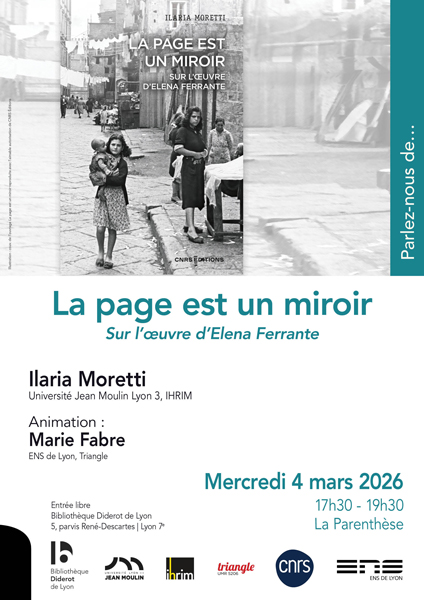 PParlez-nous de… La page est un miroir. Sur l’œuvre d’Elena Ferrante Les œuvres d’Elena Ferrante, publiées par un petit éditeur italien, sont traduites en 45 langues, pour plus de 15 millions de lecteurs. Un succès littéraire d’une telle ampleur est rare. S’il est difficile d’en saisir les raisons, ses textes parlent sans conteste à un public divers, des États-Unis à la Chine, en passant par l’Arabie Saoudite.Qu’est-ce qui explique l’intérêt suscité par cette œuvre ? Ferrante est-elle le fruit d’une opération commerciale précise ? Sommes-nous plutôt confrontés à un nouvel élan de la forme romanesque ? Comment accéder au travail d’un écrivain anonyme qui cache son identité depuis trente ans ? La brutalité du succès efface-t-elle la portée de tout discours critique ?Intervenante : Ilaria Moretti, docteure en philosophie, membre associé de l’Institut d’histoire des représentations et des idées dans les modernités – IHRIM – Université Jean Moulin Lyon 3, professeure à l’École des hautes études internationales et politiques de Lyon et chargée de cours à l’Université Jean Moulin Lyon 3.Animée par : Marie Fabre, maître de conférence en études italiennes à l’ENS de Lyon, Laboratoire Triangle.En savoir plus :Parlez-nous de…
